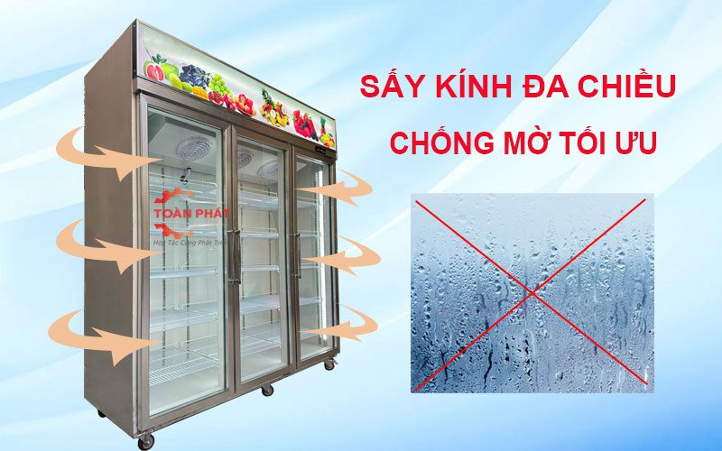 Tủ mát 3 cánh kính bảo quản hoa quả của Toàn Phát sử dụng hệ thống sấy kính đa chiều chống đọng nước, giúp kính không bị mờ khi độ ẩm cao. Mặt kính luôn khô ráo, khách hàng dễ dàng quan sát sản phẩm bên trong, tăng khả năng thúc đẩy mua hàng, tăng tính thẩm mỹ cho cửa hàng.