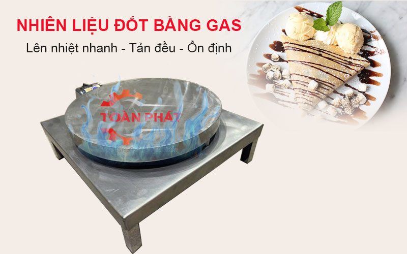 Máy được sử dụng nhiên liệu đốt bằng gas, nhiệt lên nhanh, tỏa đều khắp mặt bếp tráng bánh, hệ thống đánh lửa magneto đánh lửa nhạy, bếp gas hoạt động ổn định ngay cả khi bán liên tục, phù hợp với mô hình kinh doanh bánh crepe lưu động.
