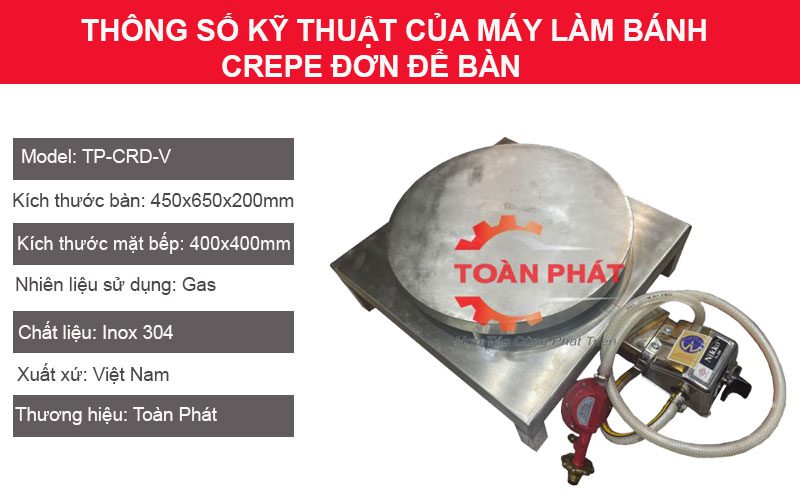 Máy làm bánh crepe đơn để bàn, thân vuông của Điện Máy Toàn Phát là thiết bị được nhiều quán ăn, xe bánh, nhà hàng và cửa hàng đồ ăn nhanh lựa chọn. Với ưu điểm nóng nhanh, tiết kiệm gas và thiết kế chắc chắn, bếp crepe Toàn Phát giúp người dùng cho ra những mẻ bánh mỏng – vàng đều – thơm ngon – đẹp mắt.