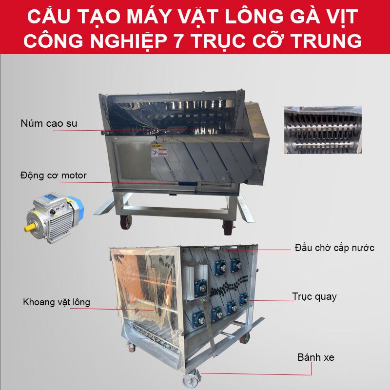 Máy vặt lông gà vịt công nghiệp 7 trục cỡ trung được thiết kế trục nằm ngang, hoạt động theo nguyên lý: 7 trục quay tròn làm cho các núm cao su cọ sát vào gà vịt tuốt sạch đi lớp lông. Các núm cao su là chất liệu cao su cao cấp nên gà vịt không bị rách da, gãy chân cánh hay dập mỏ.