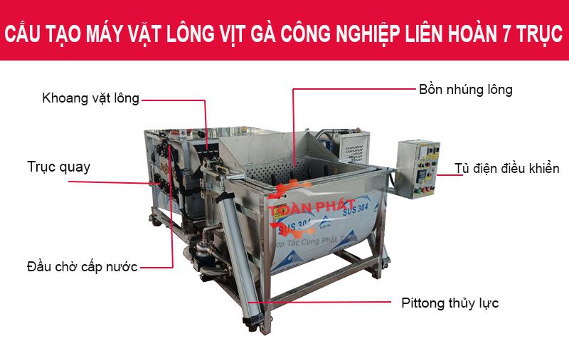 Máy vặt lông vịt gà liên hoàn 7 trục được thiết kế dạng dây chuyền tự động, cấu tạo gồm 3 bộ phận chính: